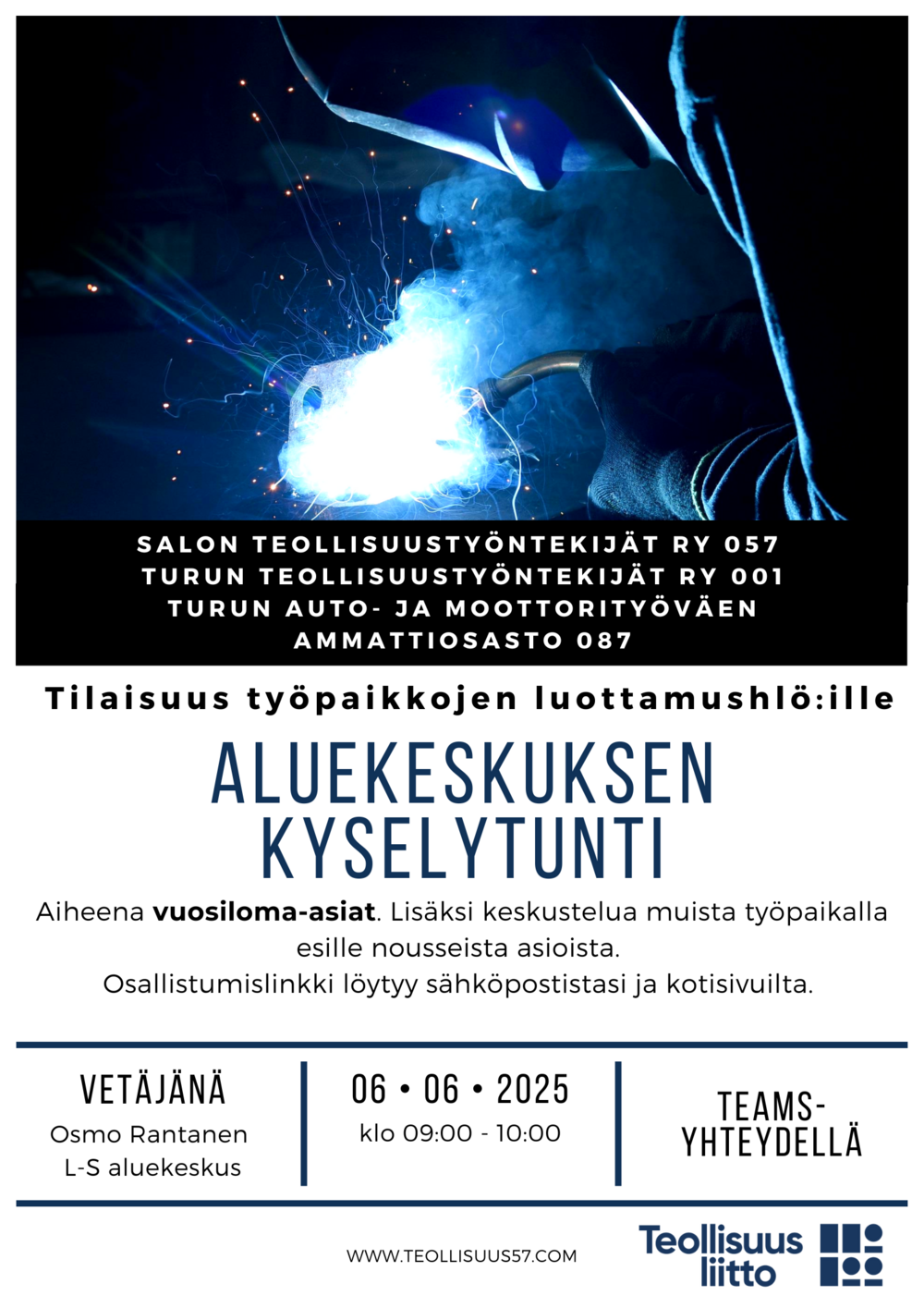 Huom. Voit lähettää kysymyksiä etukäteen osoitteeseen lounais-suomi@teollisuusliitto.fi (viestin otsikoksi KYSELYTUNTI, kerro viestissä myös nimesi, luottamustehtäväsi ja työpaikkasi). Tilaisuudessa vastataan niin moneen kysymykseen kuin ehditään ja loppuihin palataan myöhemmin.