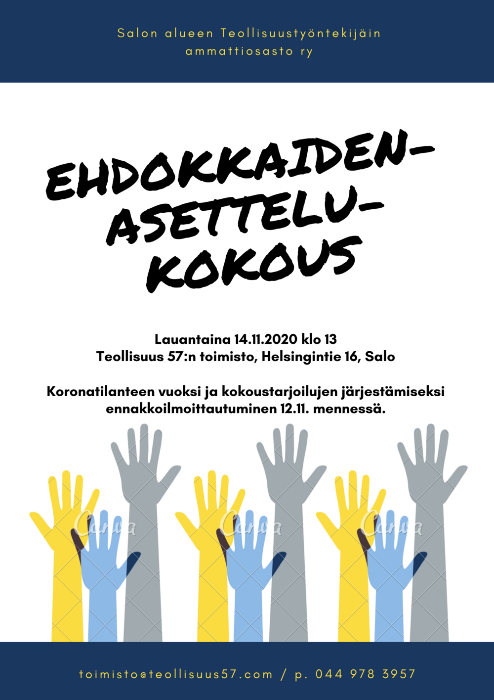 Kokouksessa käsitellään ehdokkaiden asettelu syyskokouksen henkilövalinnoiksi ammattiosaston hallituksen puheenjohtajaksi ja hallituksen varsinaisiksi sekä varajäseniksi kaudelle 2021. Koronatilanteen vuoksi ja kokoustarjoilun järjestämiseksi ennakkoilmoittautuminen 12.11. mennessä (toimisto@teollisuus57.com / p. 044 978 3957). Tervetuloa kokoukseen etenkin kaikki hallitustyöskentelystä kiinnostuneet jäsenemme!