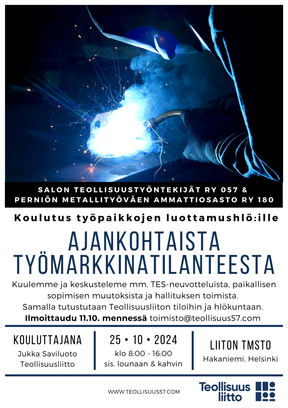 Koulutus työpaikoilla luottamustehtävissä toimiville Helsingissä, Teollisuusliiton keskustoimistolla. Kuulemme, missä mennään työmarkkinoilla esim. TES-neuvotteluiden, hallituksen toimien ja paikallisen sopimisen muutostan osalta. Samalla tutustutaan liiton tiloihin ja henkilökuntaan.