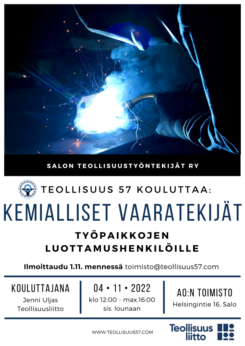 Kouluttajana toimii Jenni Uljas Teollisuusliitosta. Ammattiosasto tarjoaa lounaan ja kahvit. Ilmoittaudu 1.11. mennessä toimisto@teollisuus57.com. Tervetuloa!