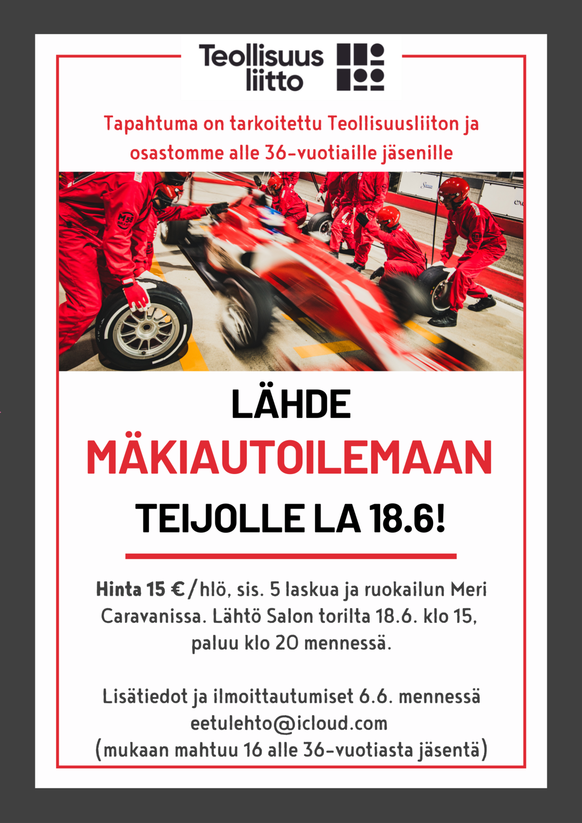 Nyt olisi tapahtumaa tarjolle alle 36-vuotiaille jäsenillemme, nimittäin mäkiautoilua Teijolla! Ilmoittaudu nopeasti, vain 16 ekaa mahtuvat mukaan. Katso tiedot alta: