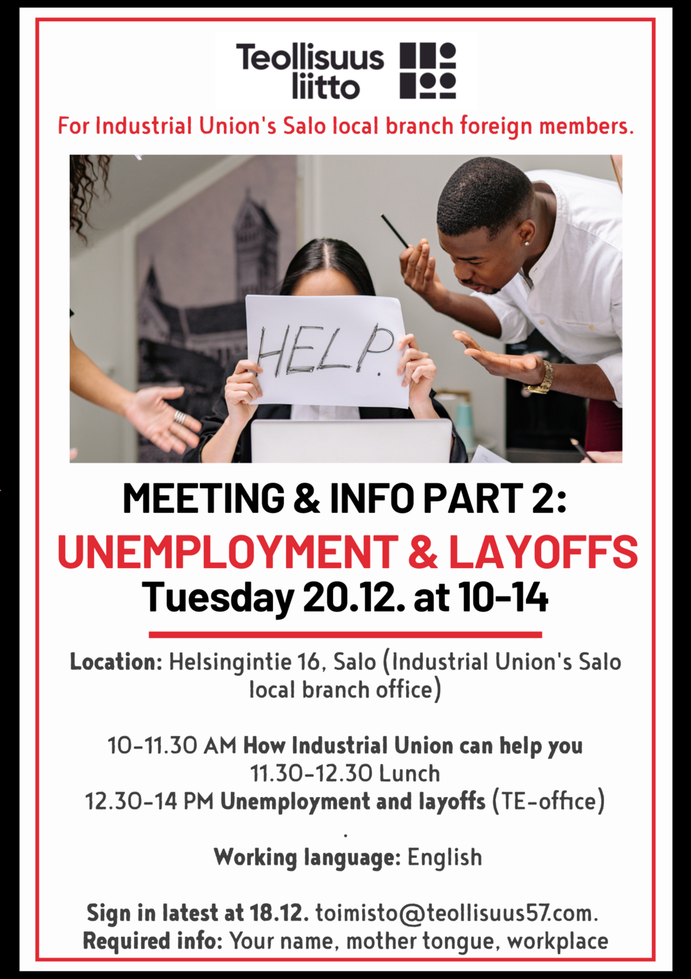 Meeting & info about unemployment and layoffs PART 2 for our foreign (non-finnish) members. You can attend if you are a member of Industrial Union and our local branch (Salon Teollisuustyöntekijät) and you are able to participate in english. Although you don't have to speak perfect english to attend :).