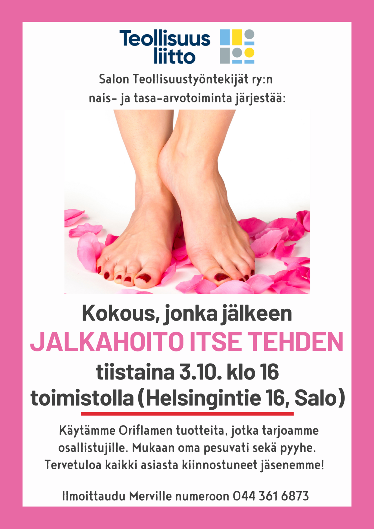 Osastomme nais- ja tasa-arvotoiminta kokoustaa toimistolla tiistaina 3.10. Kokouksen jälkeen osallistujat pääsevät tekemään jalkahoidon itselleen Oriflamen tuotteilla (osasto tarjoaa). Ota mukaan oma pyyhe ja pesuvati.