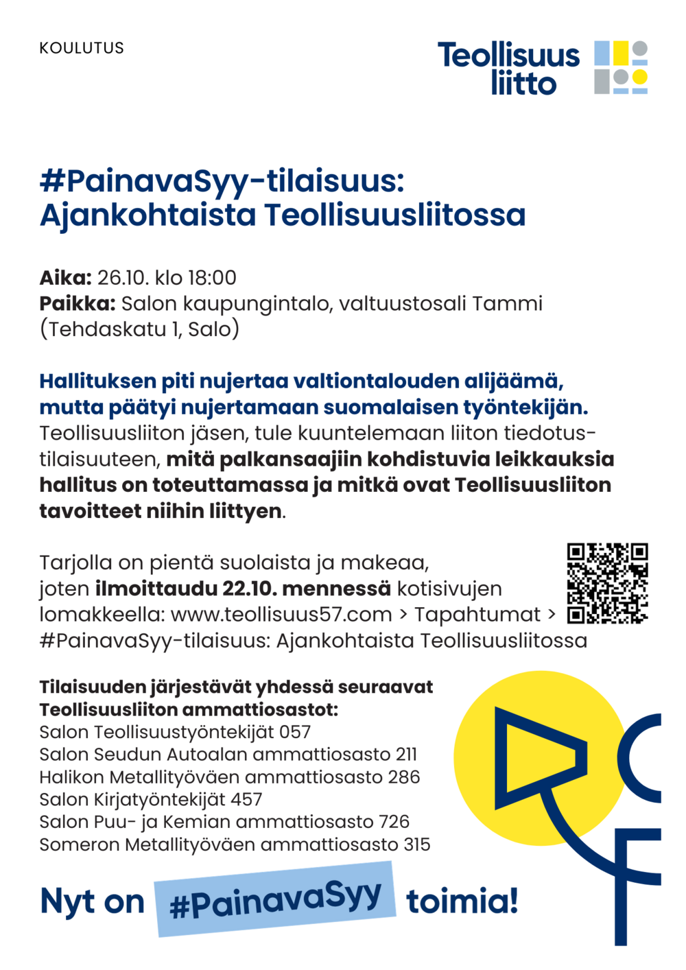 Järjestämme #PainavaSyy -tilaisuuden: Ajankohtaista Teollisuusliitossa. Tule kuuntelemaan, mistä hallituksen leikkauslistassa oikeasti on duunarin kannalta kyse ja miten liitto leikkauksiin suhtautuu!