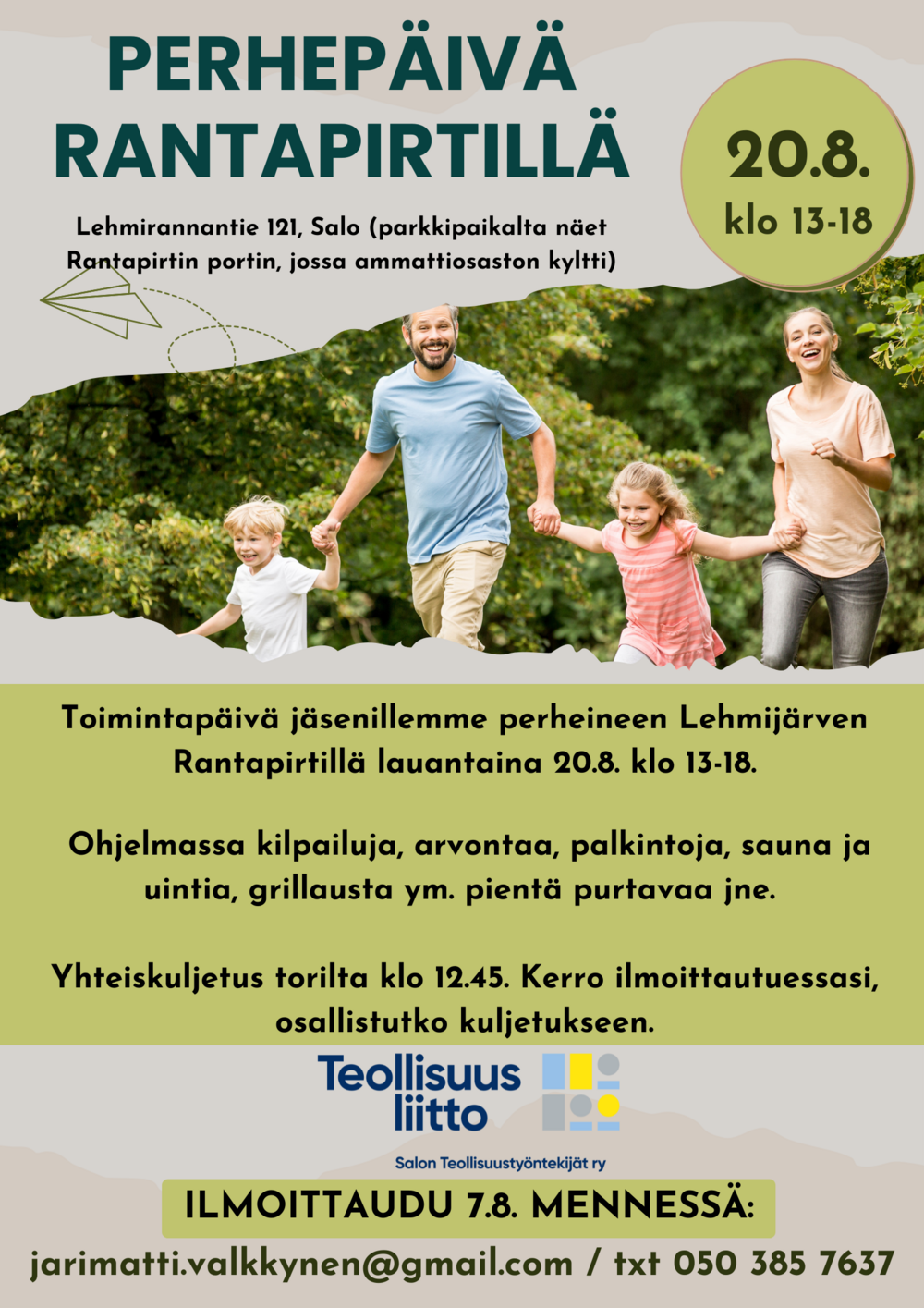 Ilmoittaudu 7.8. mennessä Jari-Matille os. jarimatti.valkkynen@gmail.com tai tekstiviestillä p. 050 385 7637.