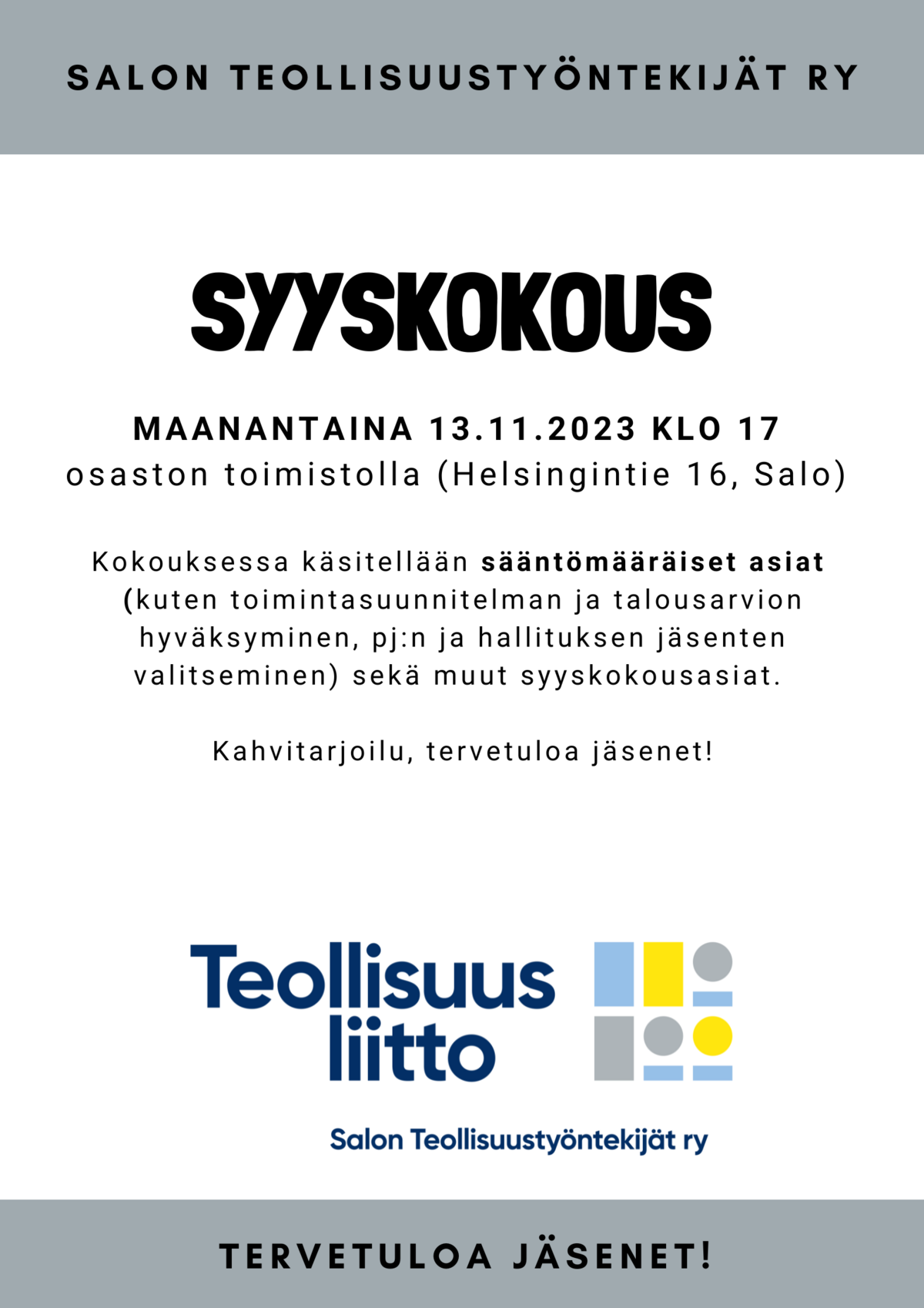 Pidämme syyskokouksen toimistolla maanantaina 13.11. klo 17.