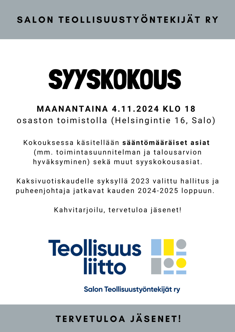 Kokouksessa käsitellään sääntömääräiset asiat eli toimintasuunnitelman ja talousarvion hyväksyminen, tilintarkastajan ja varatilintarkastajan valitseminen sekä muut syyskokousasiat. Kaksivuotiskaudelle syksyllä 2023 valittu hallitus ja puheenjohtaja jatkavat kauden 2024-2025 loppuun.
