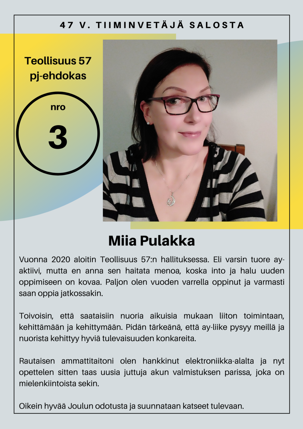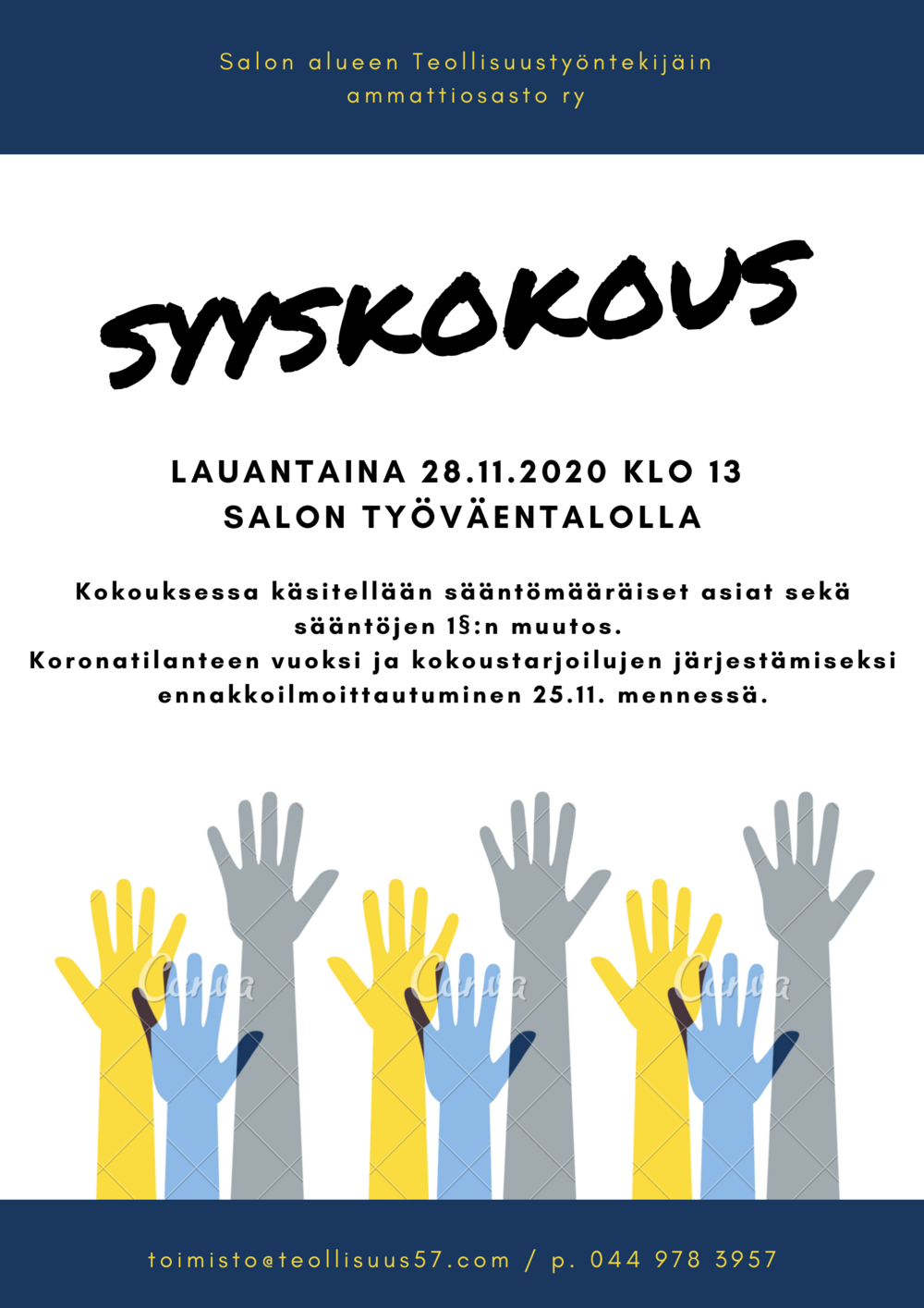 Lisäksi käsitellään sääntöjen 1§:n muutos. Koronatilanteen vuoksi ja kokoustarjoilun järjestämiseksi ennakkoilmoittautumiset 25.11. mennessä (toimisto@teollisuus57.com / p. 044 978 3957). Tervetuloa kaikki jäsenemme!