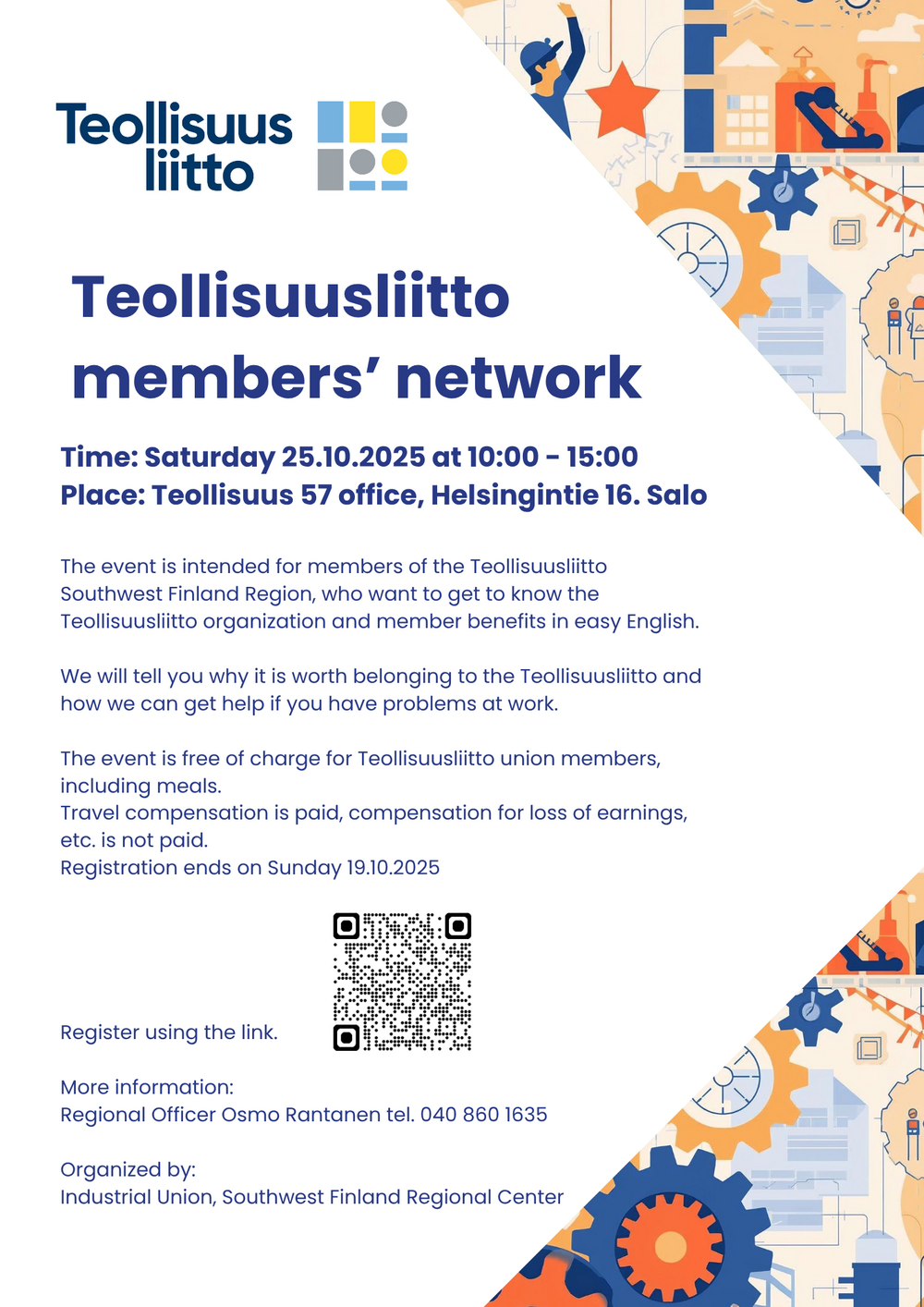 The event is free of charge for Teollisuusliitto union members, including meals. Travel compensation is paid, compensation for loss of earnings, etc. is not paid.